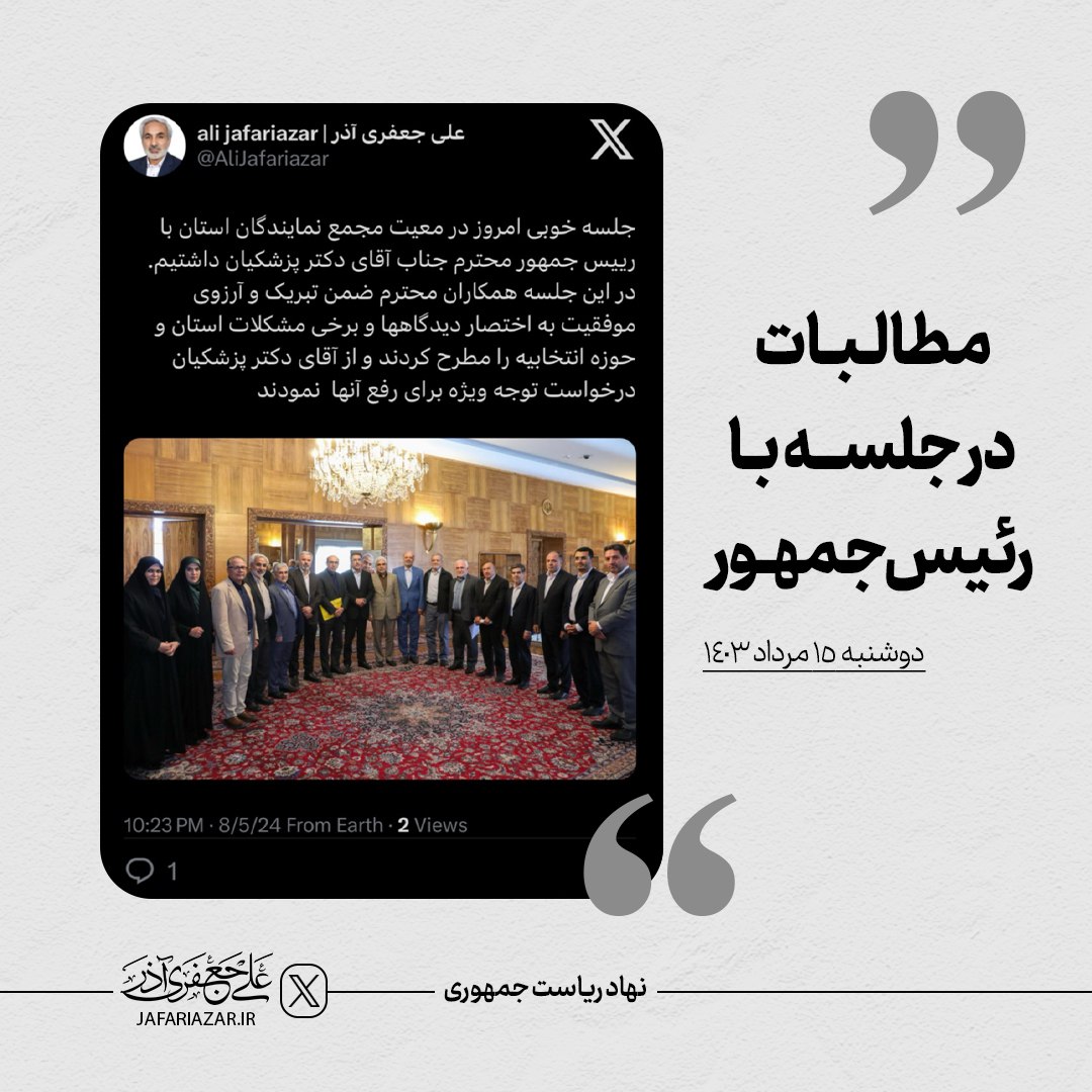 جلسه خوبی امروز دوشنبه ۱۵ مرداد در معیت مجمع نمایندگان استان با رییس جمهور محترم، جناب آقای دکتر پزشکیان داشتیم.