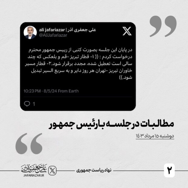 در پایان این جلسه بصورت کتبی از رییس جمهور محترم  درخواست کردم : (( ۱- قطار تبریز -قم و بلعکس که چند سالی است تعطیل شده، مجدد برقرار شود.۲- قطار مسیر خاوران تبریز -تهران هر روز دایر و به سریع السیر تبدیل شود.))