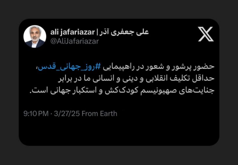 حضور پرشور و شعور در راهپیمایی #روز_جهانی_قدس، حداقل تکلیف انقلابی و دینی و انسانی ما در برابر جنایتهای صهیونیسم کودککش و استکبار جهانی است.