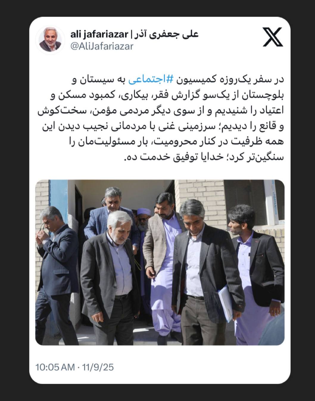 در سفر یک‌روزه کمیسیون ⁧ #اجتماعی ⁩ به سیستان‌ و بلوچستان از یک‌سو گزارش فقر، بیکاری، کمبود مسکن و اعتیاد را شنیدیم و از سوی دیگر مردمی مؤمن، سخت‌کوش و قانع را دیدیم؛ سرزمینی غنی با مردمانی نجیب دیدن این همه ظرفیت در کنار محرومیت، بار مسئولیت‌مان را سنگین‌تر کرد؛ خدایا توفیق خدمت ده. ✍️علی […]