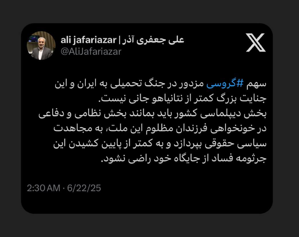 سهم « گروسی » مزدور در جنگ تحمیلی به ایران و این جنایت بزرگ کمتر از نتانیاهو جانی نیست. بخش دیپلماسی کشور باید بمانند بخش نظامی و دفاعی در خونخواهی فرزندان مظلوم این ملت، به مجاهدت سیاسی حقوقی بپردازد و به کمتر از پایین کشیدن این جرثومه فساد از جایگاه خود راضی نشود. علی جعفری […]