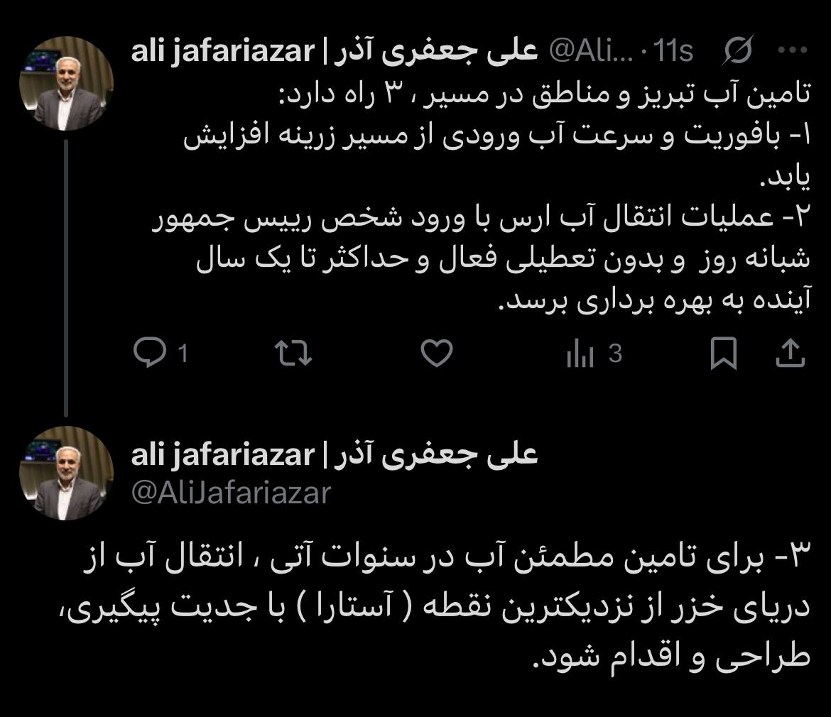 تامین آب تبریز و مناطق در مسیر ، ۳ راه دارد: ۱- بافوریت و سرعت آب ورودی از مسیر زرینه افزایش یابد. ۲- عملیات انتقال آب ارس با ورود شخص رییس جمهور شبانه روز و بدون تعطیلی فعال و حداکثر تا یک سال آینده به بهره برداری برسد. ۳- برای تامین مطمئن آب در سنوات […]