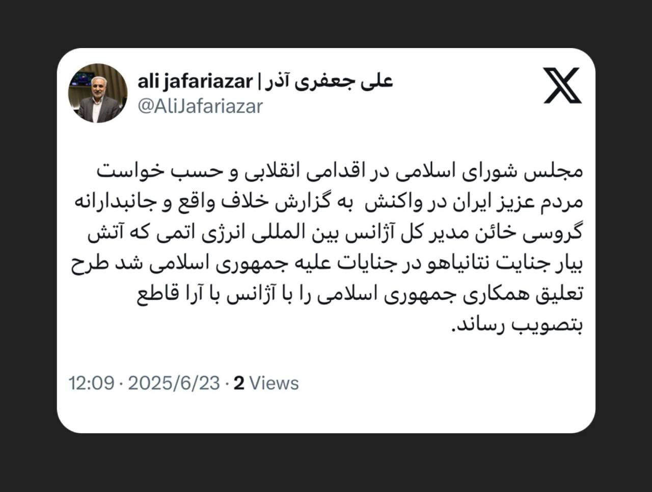 مجلس شورای اسلامی در اقدامی انقلابی و حسب خواست مردم عزیز ایران، در واکنش  به گزارش خلاف واقع و جانبدارانه « گروسی » خائن مدیر کل آژانس بین المللی انرژی اتمی که آتش بیار جنایت نتانیاهو در جنایات اخیر علیه جمهوری اسلامی شد، طرح تعلیق همکاری جمهوری اسلامی را با آژانس با آرا قاطع به تصویب رساند. تا چشم و پای نامحرمان دیوسیرت از این مراکز دور باشد.