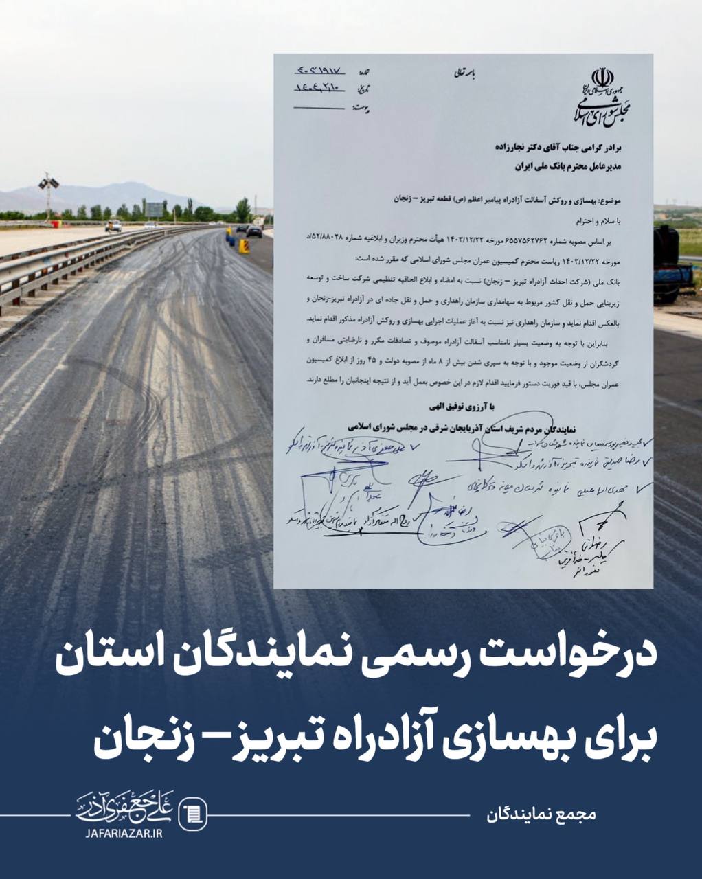 به گزارش دفتر ارتباطات مردمی دکتر علی جعفریآذر نماینده مردم شریف تبریز، آذرشهر و اسکو در مجلس شورای اسلامی، جمعی از نمایندگان استان آذربایجان شرقی با ارسال نامهای به تاریخ ۱۴۰۴/۲/۱۰ خطاب به مدیرعامل بانک ملی ایران، خواستار آغاز فوری عملیات بهسازی و روکش آسفالت آزادراه پیامبر اعظم (ص) در مسیر تبریز – زنجان شدند.