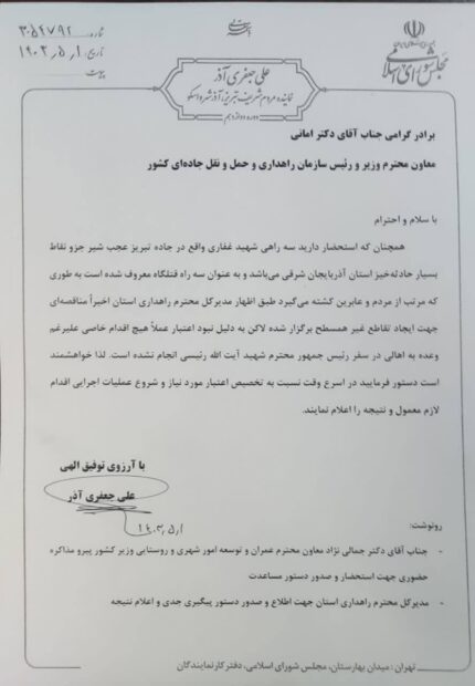 به اطلاع مردم شریف و مسئولان عزیز شهرستان آذرشهر میرساند، در ادامه پیگیری اجرای تقاطع غیر همسطح سه راهی شهید غفاری آذرشهر، که طبق اعلام مدیرکل راهداری استان مناقصه آن برگزار ، ولی به علت عدم تامین اعتبار، اجرای آن متوقف شده بود.